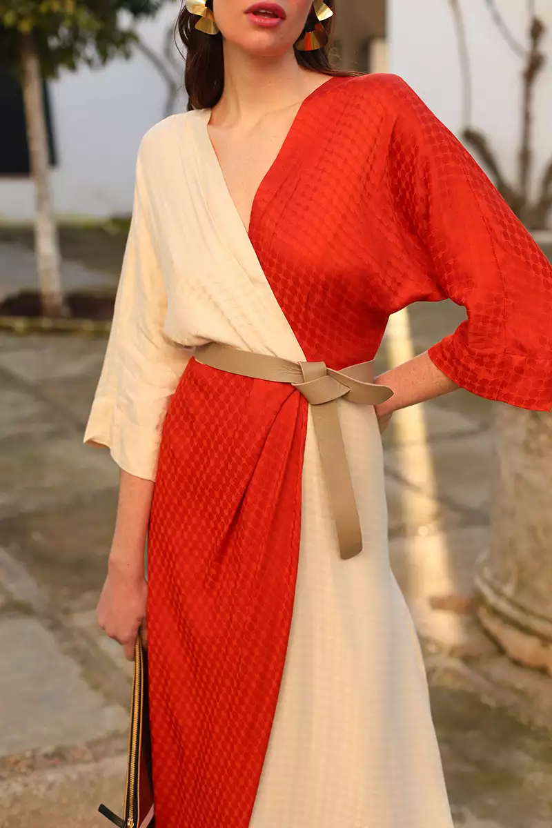 Vestido largo bicolor en tonos crudo y caldera, escote en V, mangas 3/4, su vuelo tipo pareo hará que te sientas especial a cada paso que das.