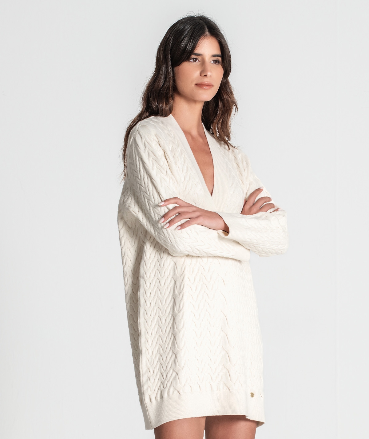 Vestido en color mostaza con palmera en contraste. Detalle de tirantes y bajo con flecos que aporta un toque distintivo.
