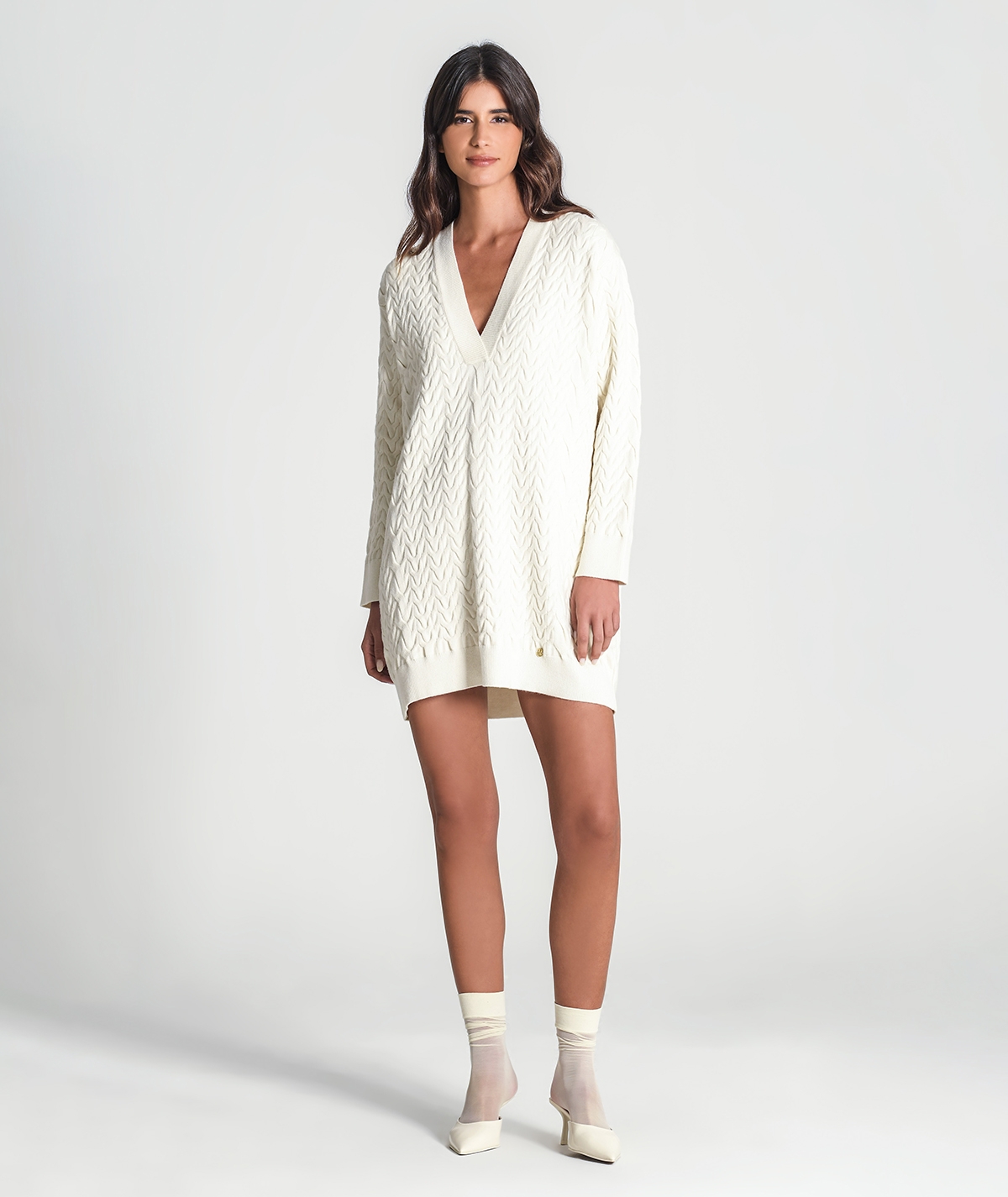 Vestido estructurado, color crudo, escote en V, corte recto.