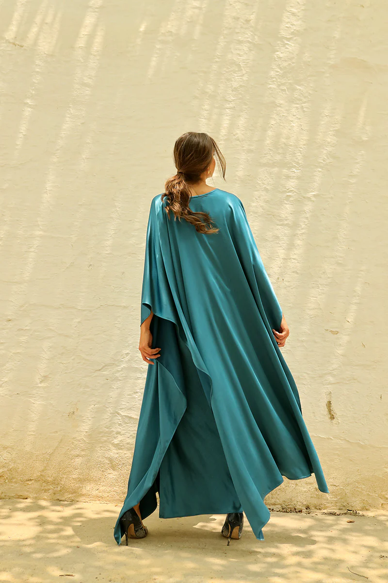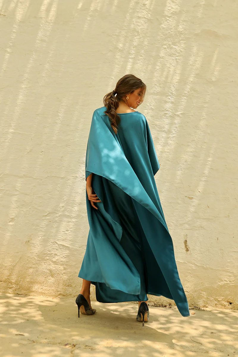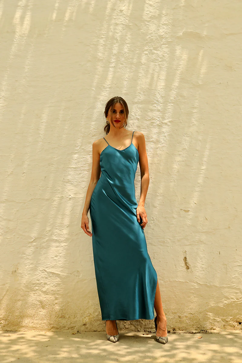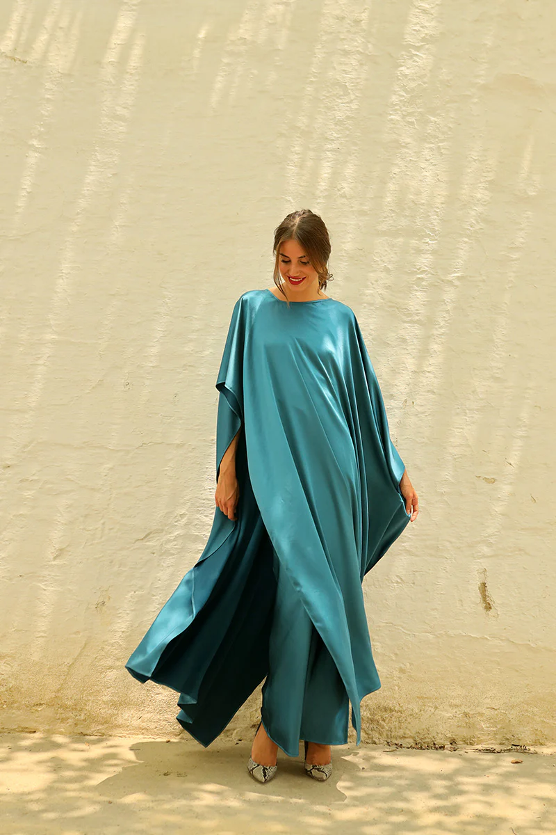 Conjunto de dos piezas espectacular formado por un vestido largo lencero y una capa a juego. El vestido largo estilo lencero destaca por su caída fluida y efecto satinado que aporta