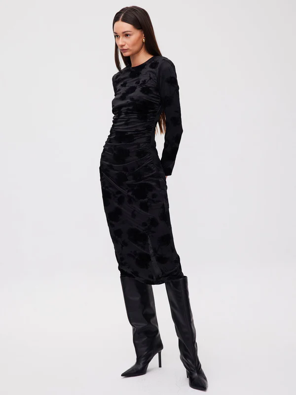 • Tejido elástico con flores flocadas terciopelo negro